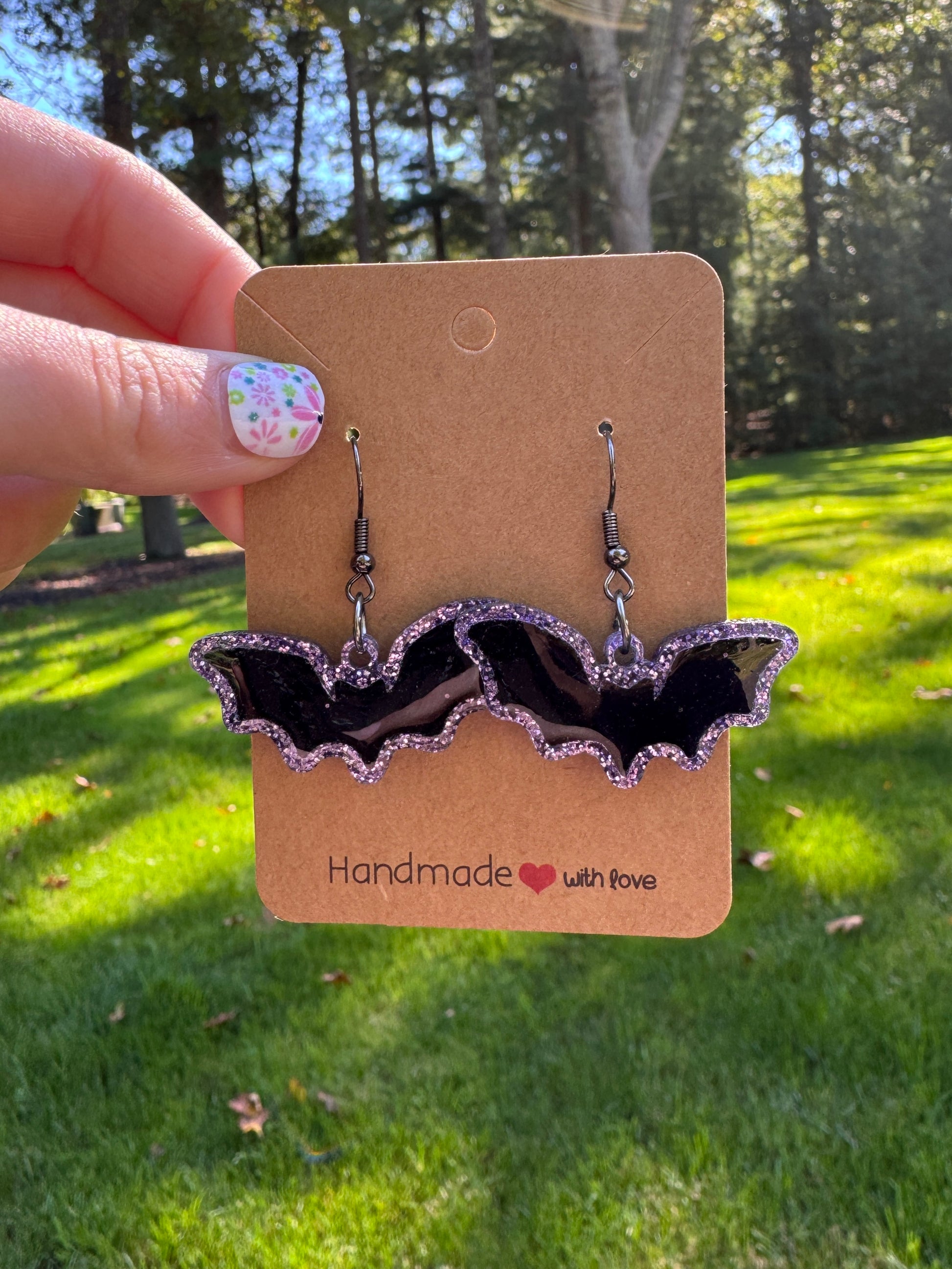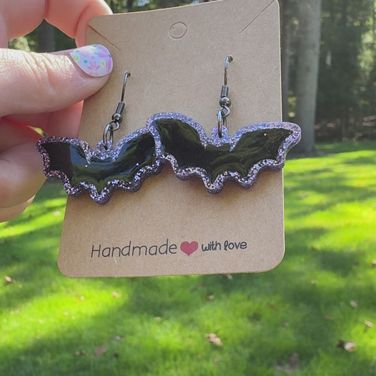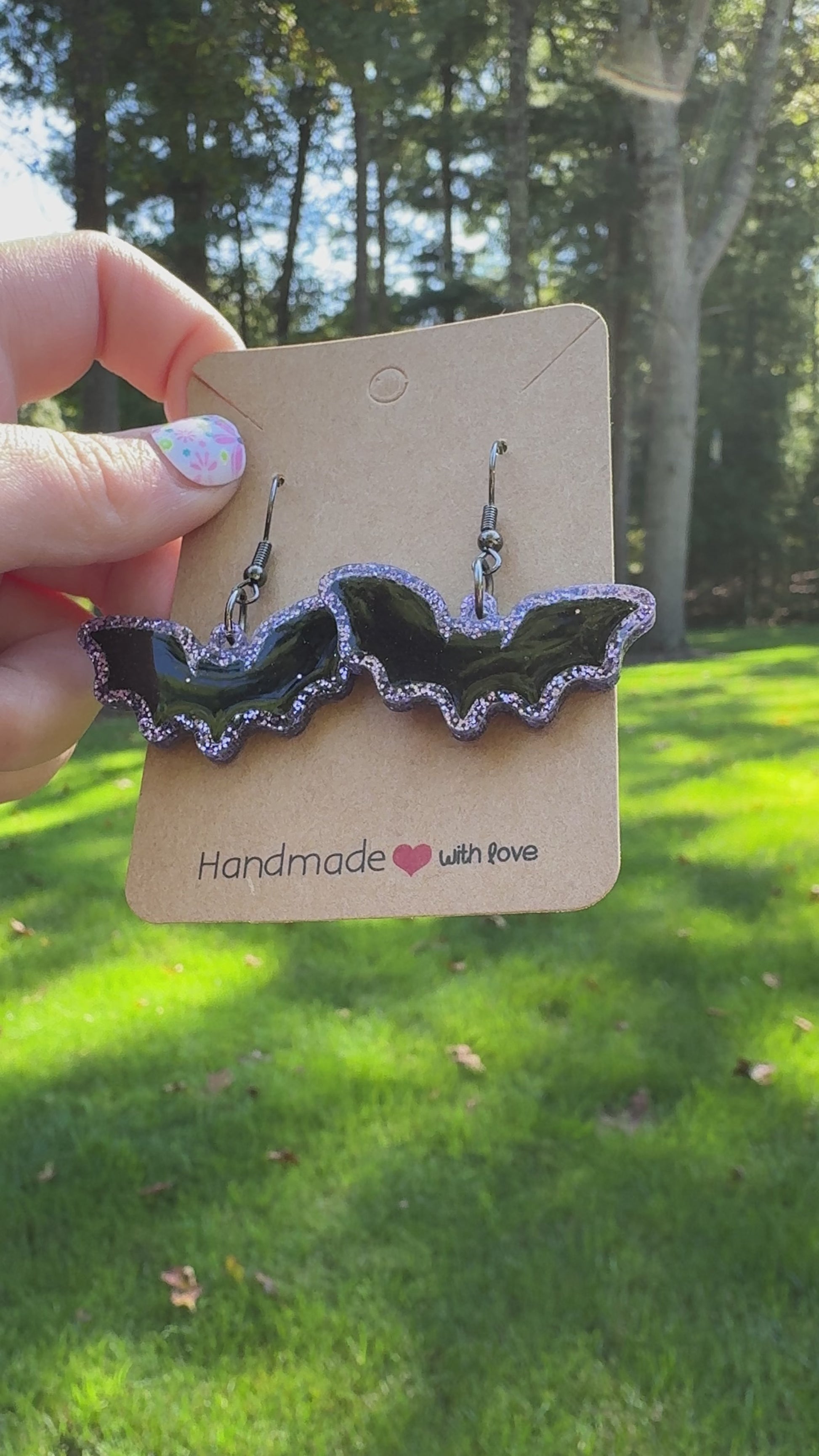 Add a touch of eerie elegance to your Halloween look with these Black Sparkly Bats earrings. Featuring a bezel crafted from black acrylic embedded with purple sparkles, they capture the mysterious glow of a moonlit night. Perfectly designed for seasonal accessorizing, these lightweight earrings combine festive charm with expert craftsmanship for a standout statement piece.